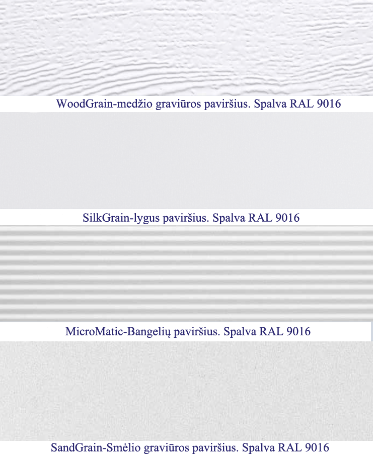Pasirinkus paviršius esančius aukščiau, galime juos pateikti beveik pagal visą RAL paletę, bei standartines Hormann spalvas: