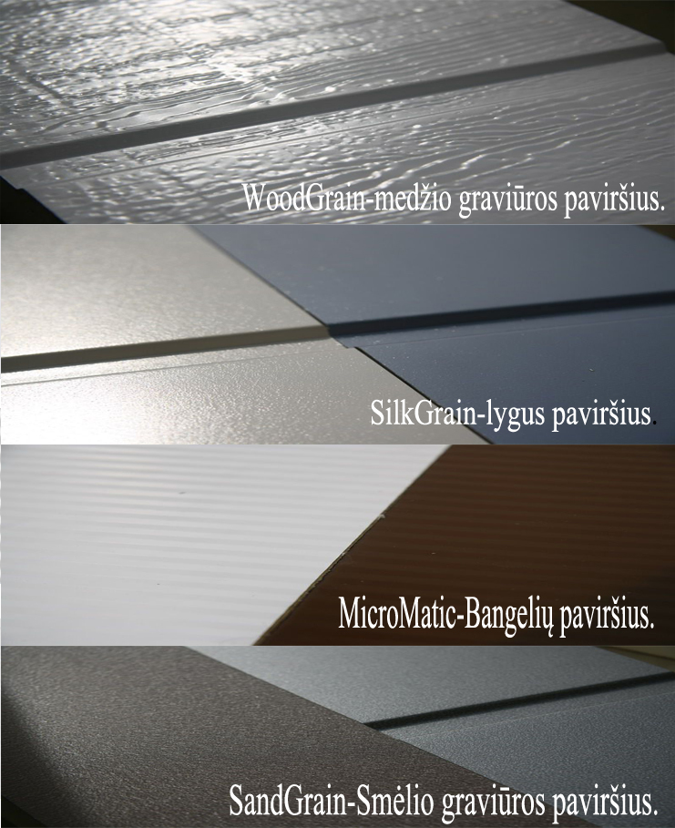 Jeigu netinka standartinės spalvos ir norisi daugiau išskirtinumo, rinkitės medžio imitacijos ar titano paviršius: